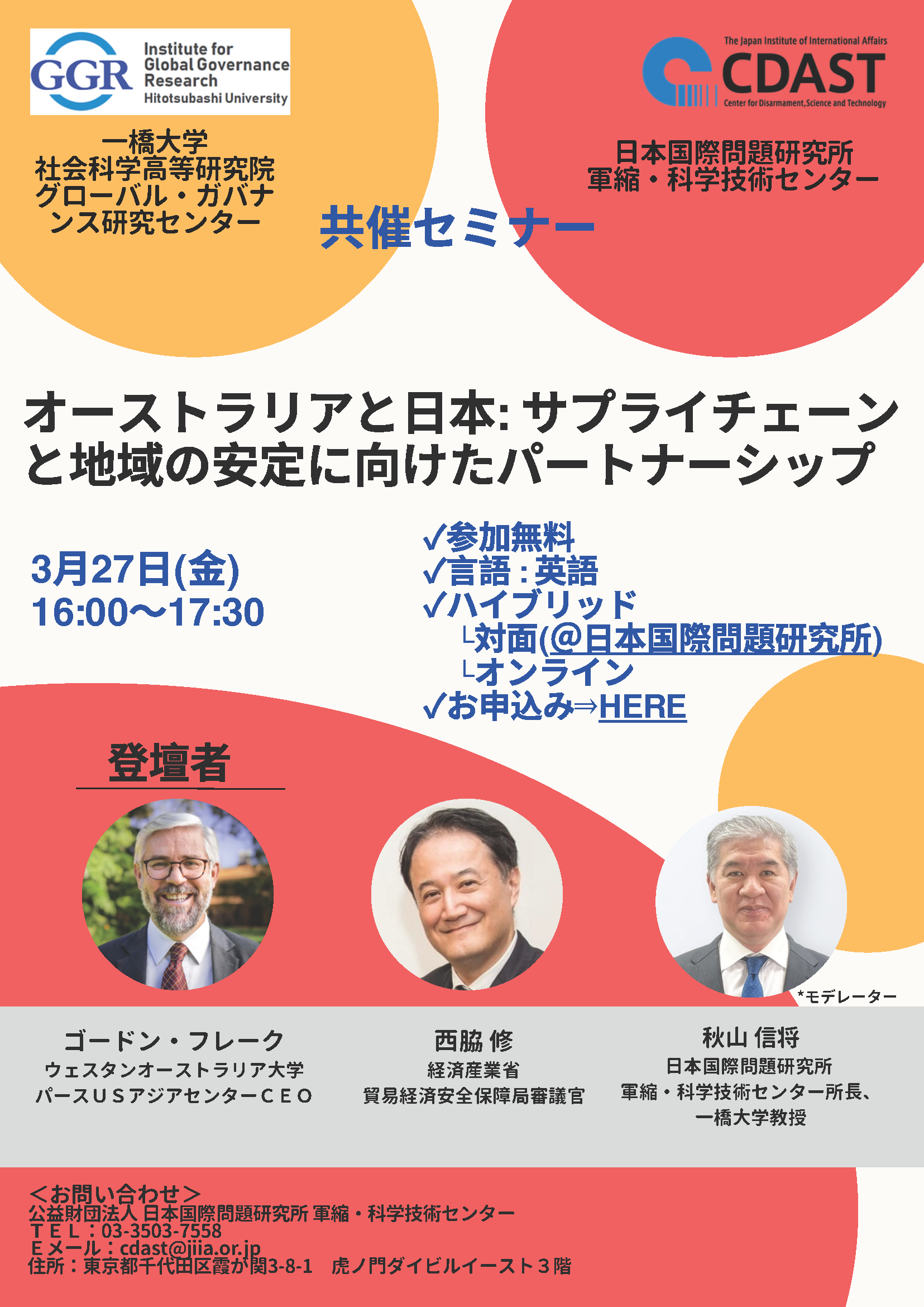対面とオンラインのハイブリッド型式 対面:日本国際問題研究所大会議室 オンライン:ウェビナーのリンクは申し込み後にお知らせいたします。