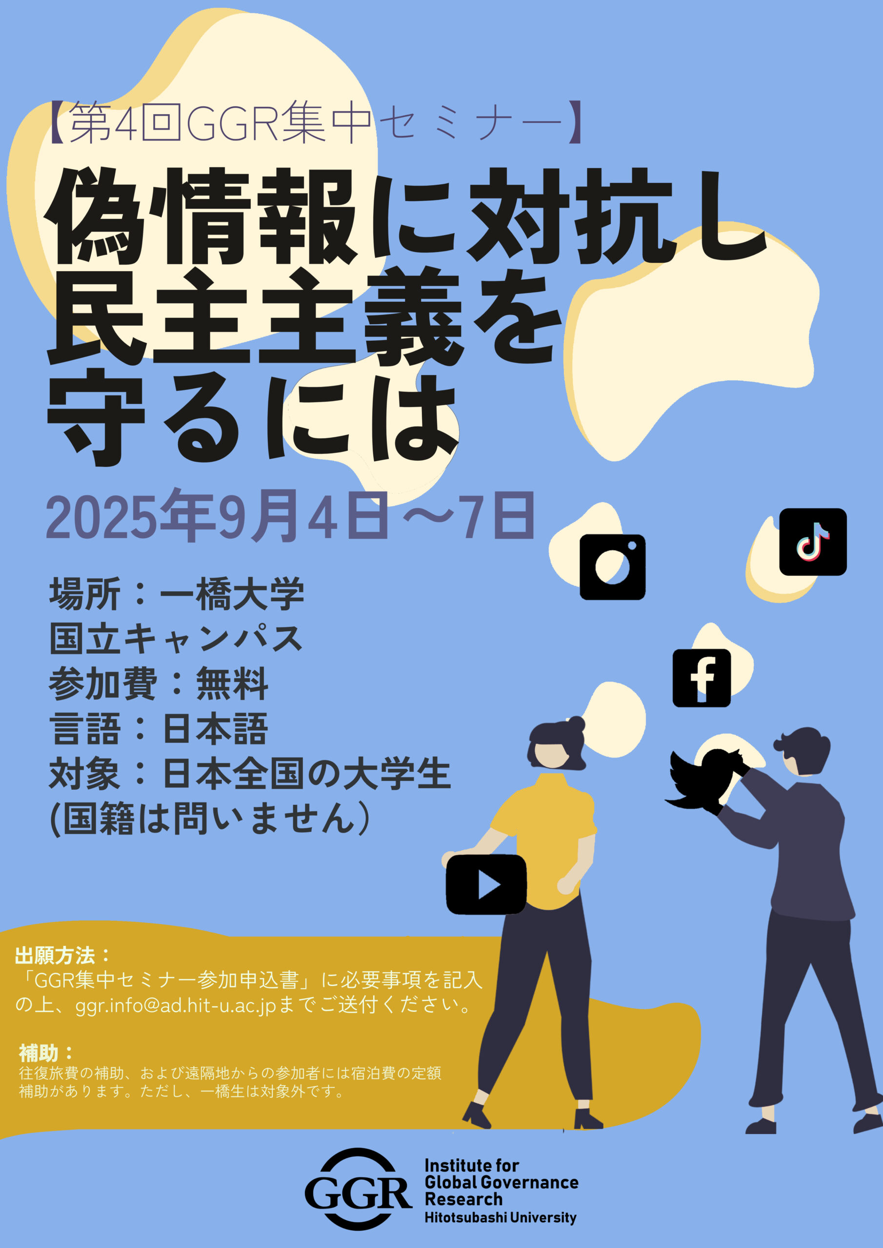 | 補助: | 往復の旅費、宿泊費を提供します (宿泊費は遠方から参加の場合のみ。ただし一橋生は補助対象外) |