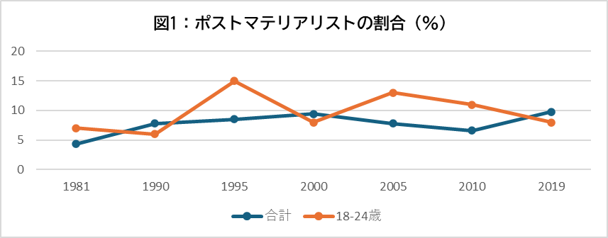 ポストマテリアリズム指標に関しては、「ポストマテリアリスト」と分類される人々の全体的な割合が、1981年の4.3%から2000年には9.4%へと増加している[12]。この傾向は綿貫(1994)の知見とも一致している。しかしその後は、図1の青線に示されているように、低下または変動を示す[13]。表1はまた、18〜24歳の回答者における「ポストマテリアリスト」の割合が、2019年においても1981年と同様に低水準であることを示している(図1のオレンジ線にて表示)[14]。