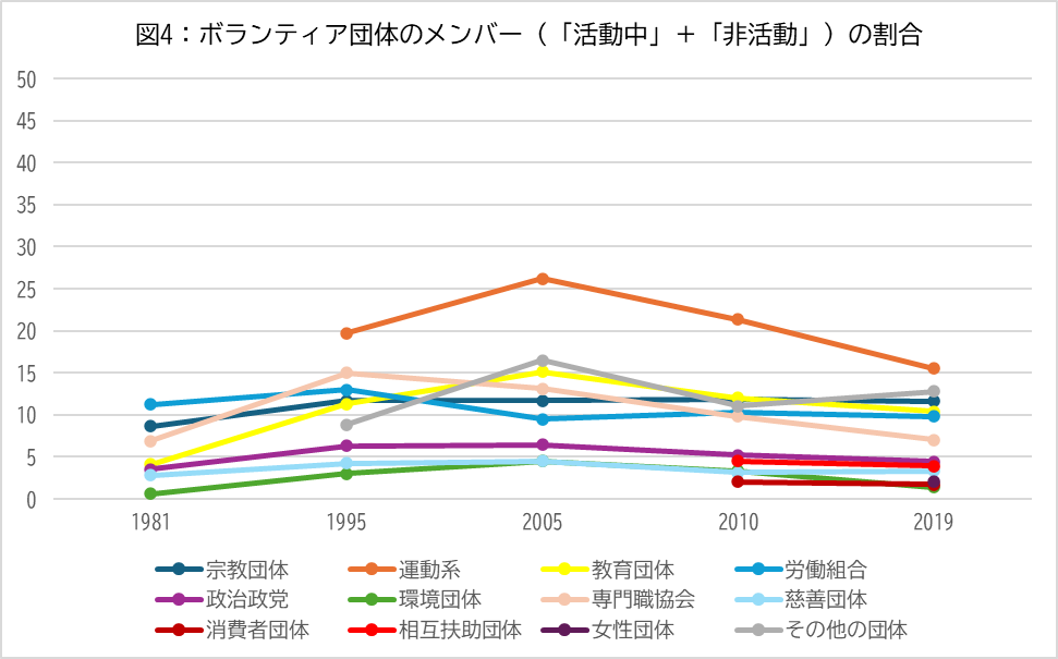 多くの研究者が、結社性と民主主義との関係について検討してきた(Putnam et al. 1993, 2002)。世界価値観調査(World Values Survey)では、回答者に対して12の任意団体への所属状況を尋ねており、図4はこれらの団体に「積極的に参加している」および「非積極的に参加している」回答者の割合をまとめたものである[18]。図からは、日本では任意団体に所属している人の割合が非常に少ないことが分かる。2005年頃までは上昇傾向が見られたが[19]、それ以降は、環境団体、慈善団体、政党において、その割合は減少傾向または一貫して低い水準にとどまっている。18〜24歳の年齢層における所属率は、スポーツ団体を除いて全体平均をさらに下回っている。