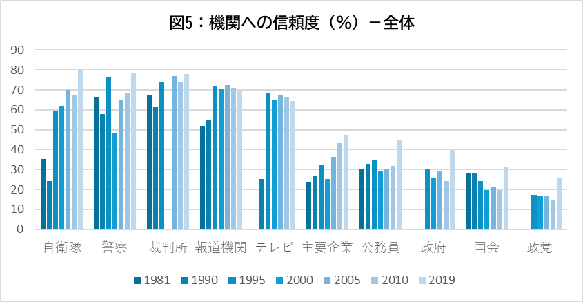 本節では、社会的信頼および政治的信頼の両方を検討する。前者は他者(たとえば家族や初対面の人々)に対する信頼の程度を、後者は制度や組織に対する信頼水準を扱う。社会的信頼に関しては、表3に猪口(2002: 389)が指摘する信頼の類型が継続していることを示唆しているように思われる[20]。猪口は、「アメリカの信頼はより広範で開かれている一方、日本の信頼はより狭く閉ざされている」と論じている(2002: 389)[21]。2019年の世界価値観調査(WVS)でも、日本人は家族や知人には信頼を寄せているが、初対面の人や異国籍の人に対しては信頼を大きく制限していることが示されている。一般的に、若年層ほど高年層に比べて信頼水準が低い傾向が見られる。これに対し、アメリカでは2017年時点で約40%の人が「初対面の人を信頼する」と回答しており、18〜24歳の年齢層に限定しても28%が初対面の人に信頼を寄せている[22]。