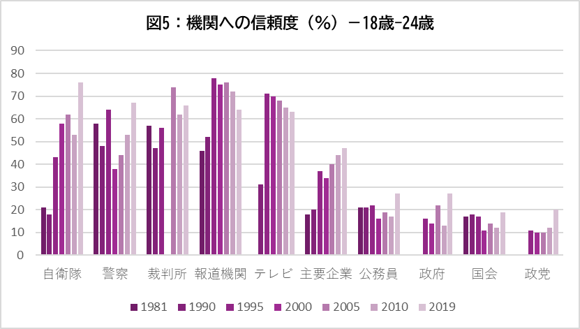 制度への信頼に関して、猪口(2002)は、日本人は政党性のない制度(たとえば「裁判所、警察、官僚機構、軍隊」)に対する信頼の方が、政党性のある制度(「国会、政党、選挙で選ばれた政府、政治指導者、大企業、マスメディア」など)に対する信頼よりも高いことを指摘している(2002: 378)。図5および図6は、この傾向を視覚的に示している。図5は1981年から2019年までの各年において、これらの制度に対して「非常に信頼している」と回答した人の割合を示しており、図6は18〜24歳の年齢層に焦点を当てたものである。いずれの図も、調査年による増減はあるものの、全体として同様の傾向を示している。ただし、新聞およびテレビについてはこの限りではない[23]。18〜24歳の回答者においては、政党性のある制度への信頼の割合が全体の回答者よりも低くなっている。